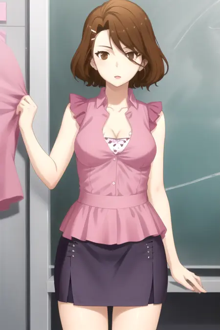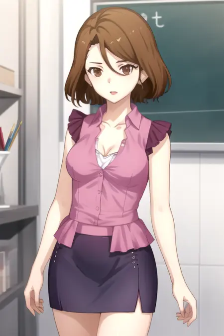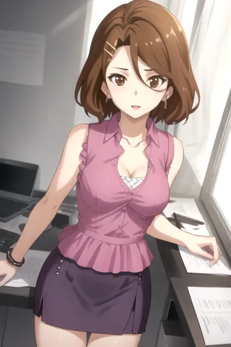 MitsukiIchijo, 1girl, solo, short hair, miniskirt, medium breasts, brown hair, pink shirt, cleavage, brown eyes, sleeveless, miniskirt, pencil skirt, purple skirt