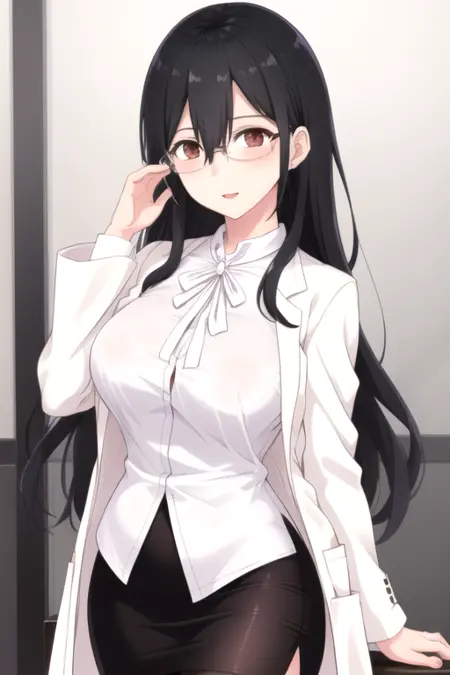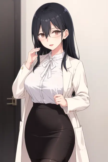 MayuriHanyu, 1girl, solo, long hair, black skirt, large breasts, white shirt, black hair, long sleeves, hair between eyes, brown eyes, black pantyhose, glasses, white coat, white ribbon, pencil skirt, labcoat
