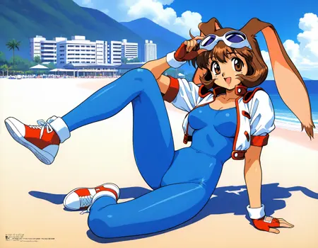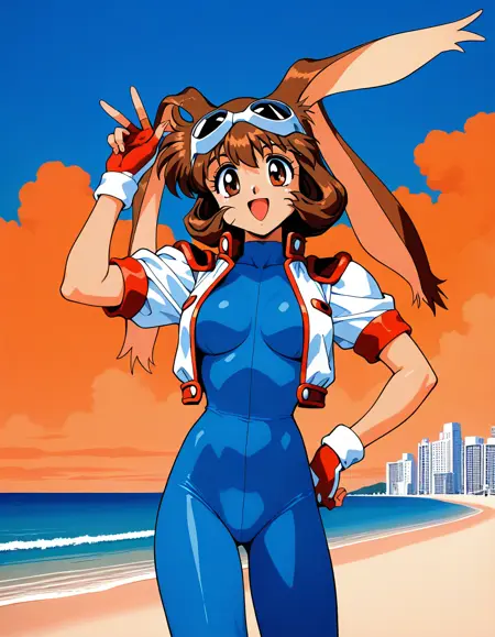 Makihara_Arina, 棕色头发,动物耳朵,头戴护目镜,兔耳,棕色眼睛,中等胸部,1990年代风格,