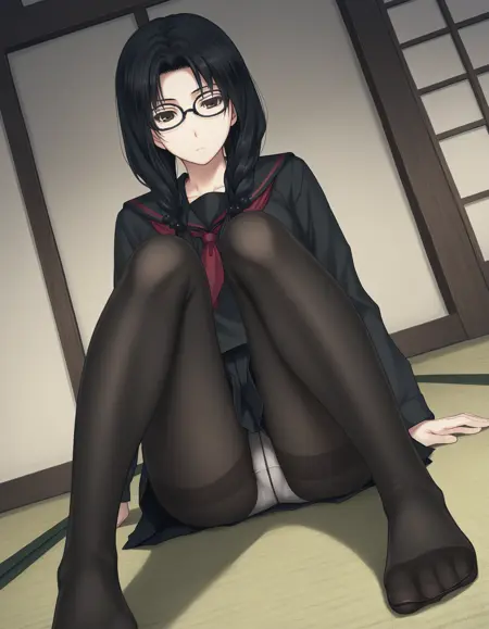 futami yuu, black hair, long hair, hair over shoulder, twin braids, black hair ornament, brown eyes, black glasses
