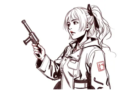 ink style , 1girl, greyscale ,long hair ,monochrome , solo ,standing , weapon ,