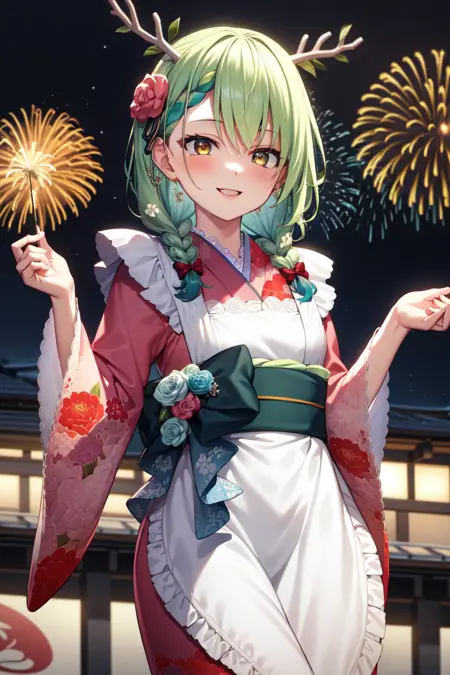 "FaunaKimono, long hair, twin braids, hair ornament, pink kimono, floral print, bow, apron, sash"
