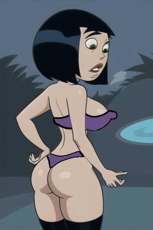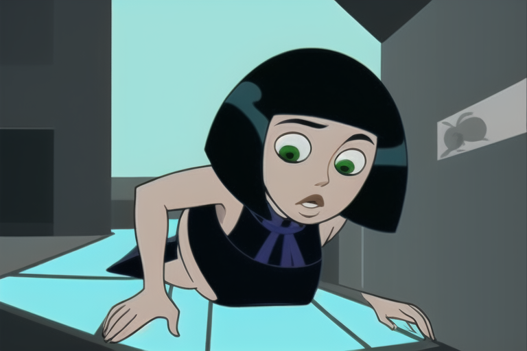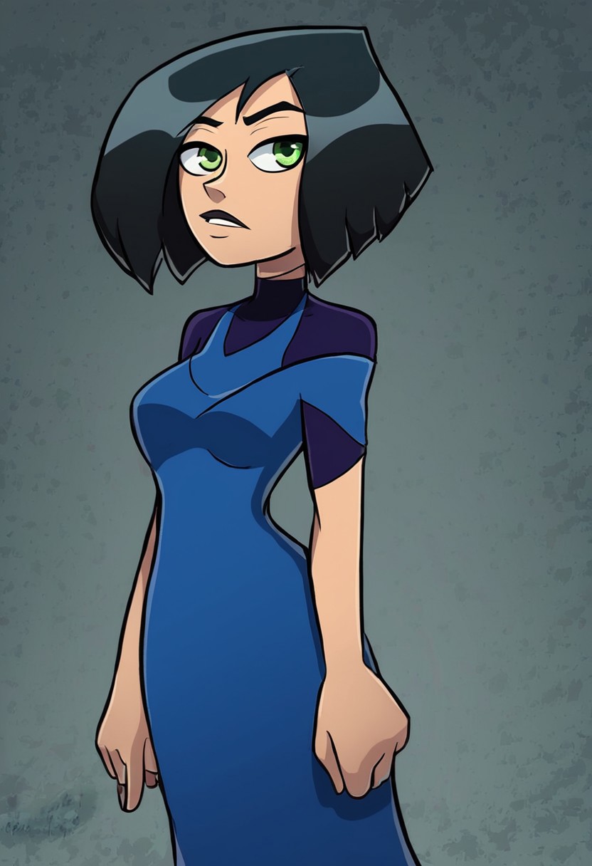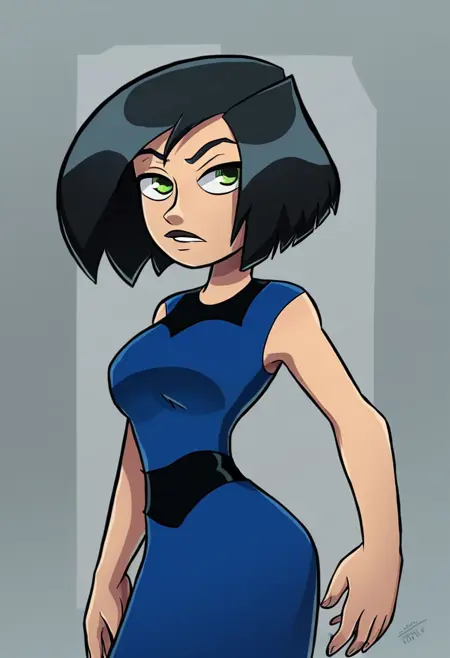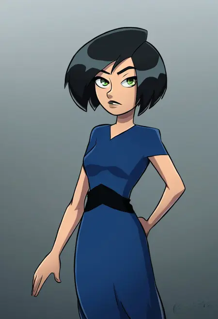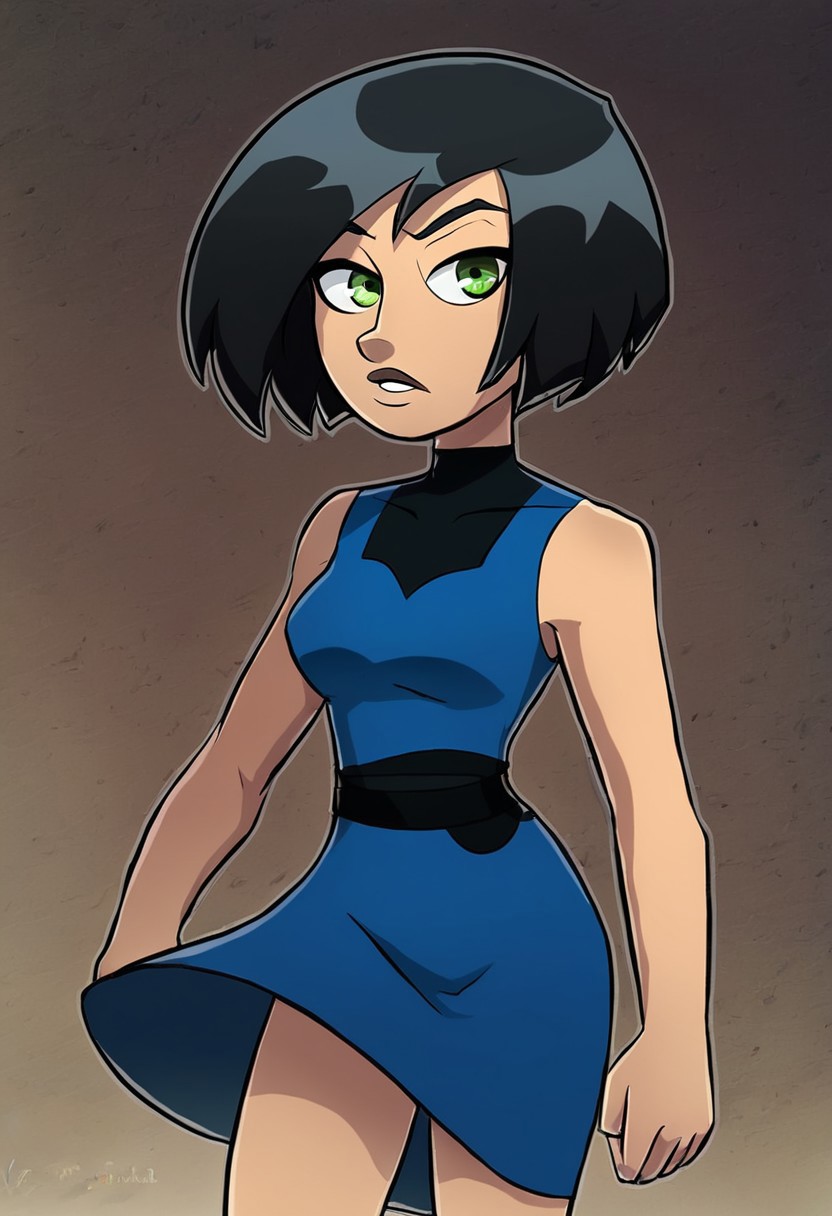 cartoon, 1 girl, solo, dress,navy blue dress, black hair, short haircut, bob haircut , green eyes