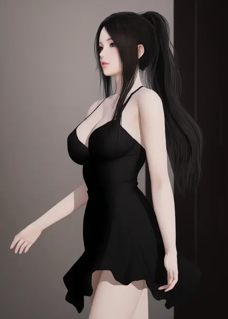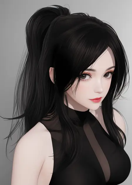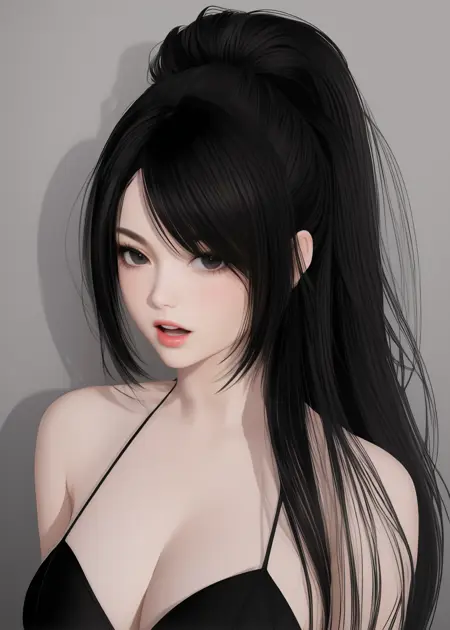 qiqi, 1girl, long hair, black hair, ponytail, black eyes, lips, makeup, large breasts,