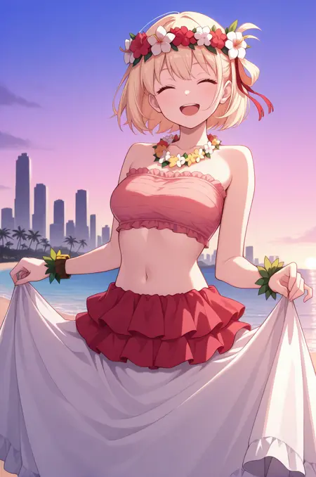 衣装9:片側アップ、髪リボン、赤リボン、頭輪、花輪、花のネックレス、ピンクのチューブトップ、ロングスカート、フリル付きスカート、レイヤードスカート、赤いスカート、白いスカート、葉のブレスレット