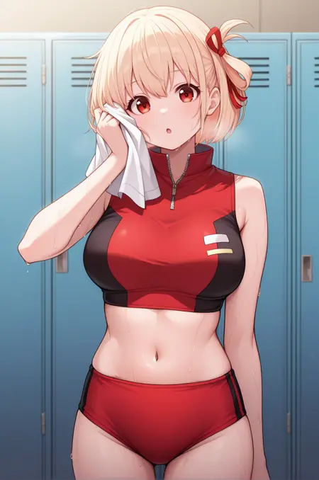 衣装7:片側アップ、髪リボン、赤リボン、ツートーンスポーツブラ、赤いスポーツブラ、黒いスポーツブラ、ジッパー、赤いブルーマ