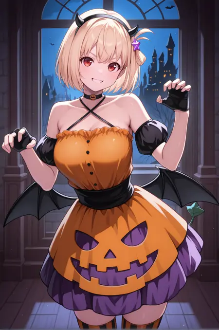衣装10:片側アップ、紫の星型髪飾り、フェイクホーン、黒いホーン、フェイクウィング、黒いウィング、フェイクテール、緑のテール、黒いチョーカー、ハーネック、クロスハーネック、多色のドレス、オレンジのドレス、紫のドレス、黒のドレス、かぼちゃのコスチューム、肩出し、黒い袖、ふくらはぎ袖、縦縞のタイツ、ツートーンタイツ、黒いタイツ、オレンジのタイツ、フィンガーレスグローブ、黒いグローブ