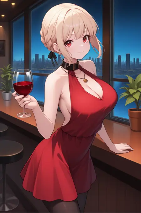 衣装4:髪の結び目、編み髪、サイドロック、髪のビーズ、黒いリボン、黒いカラー、ペンダント、赤いドレス、ノースリーブドレス、バックレスドレス、胸元、黒いタイツ