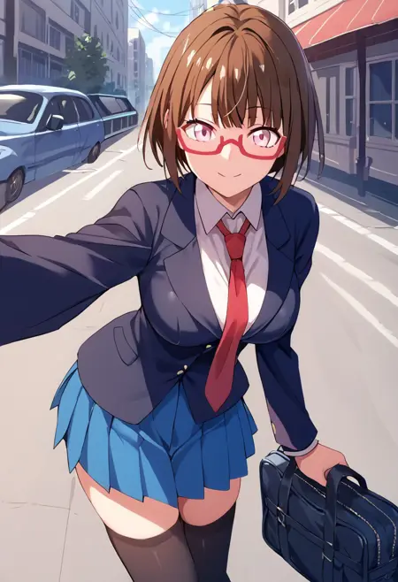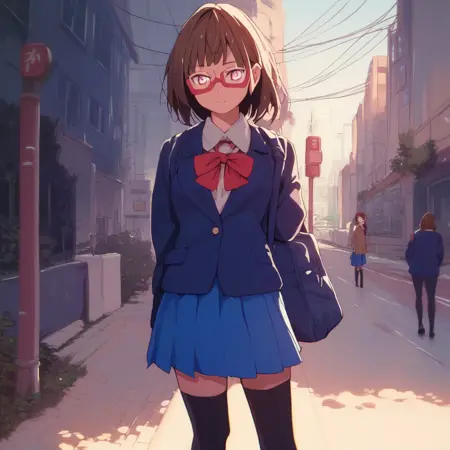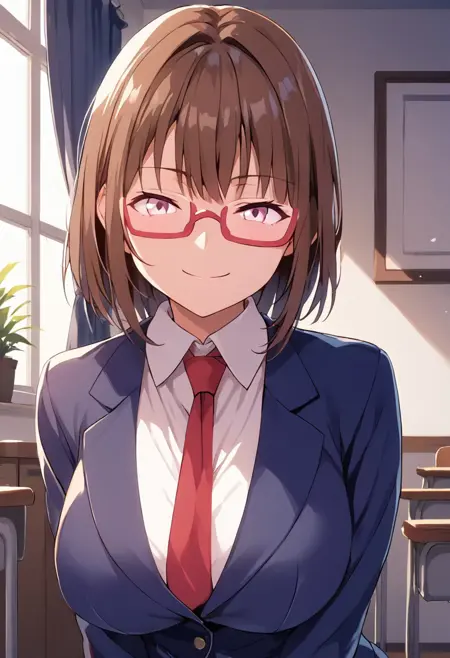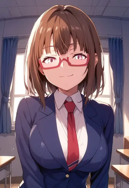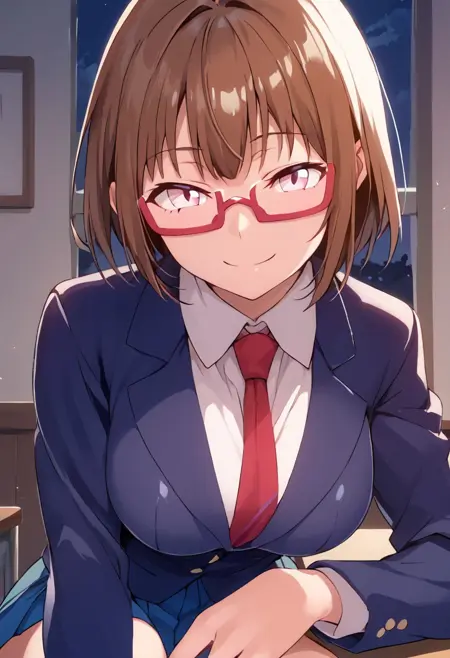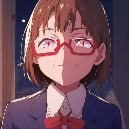 Chitose, female, red glasses,short hair, brown hair/red hair, pink eyes,