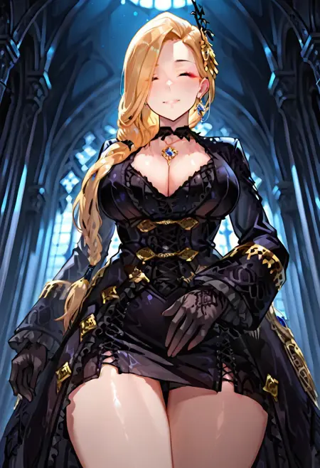 헤드 액세서리, 귀 액세서리, 목걸이, 검은 장갑, 네크웨어, 긴 우아한 드레스, 미니스커트, 허벅지까지 오는 부츠