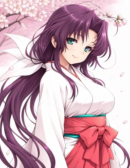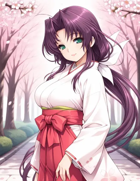 トリガーワードに加えpurple hair, green eyes, long hair, ribbonを入れると安定します。