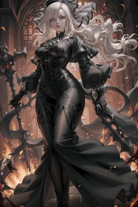 标记:krd,黑色领结,黑色连衣裙,黑色手套,黑色帽子,蓝色眼睛,飘浮的头发,长发,长袖,眼下一颗痣,面纱,长裙,长款连衣裙,白发