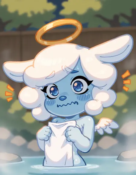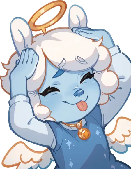 프롬프트: chibi, Angie, blue body, white fluffy hair, blue eyes, blue nose, white sleeves, blue dress, golden halo, white wings.