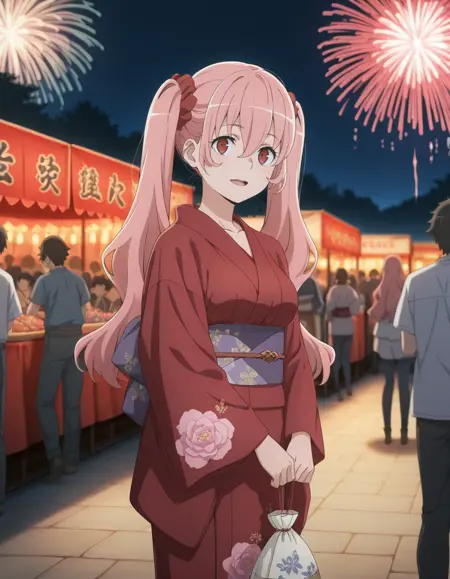<lora:heith_velvet-danmachi_s5-anime-soralz:1>, heith velvet (danmachi s5), 长发, 粉色头发, 双马尾, 发丝遮眼, 红色眼睛