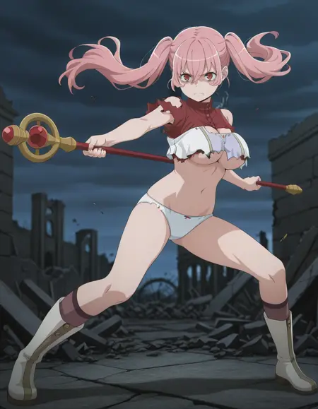 <lora:heith_velvet-danmachi_s5-ixl-anime-soralz:1>, heith velvet (danmachi), 长发, 粉色头发, 双马尾, 发丝遮眼, 红色眼睛