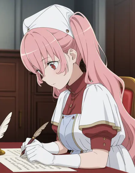 <lora:heith_velvet-danmachi_s5-anime-soralz:1>, heith velvet (danmachi s5), long hair, pink hair, twintails, hair between eyes, red eyes