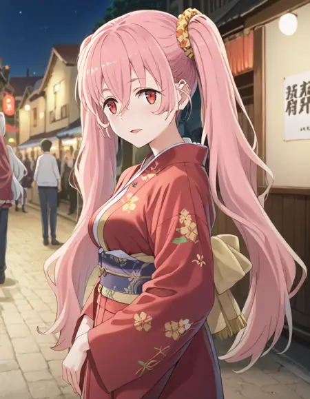 <lora:heith_velvet-danmachi_s5-ixl-anime-soralz:1>, heith velvet (danmachi), long hair, pink hair, twintails, hair between eyes, red eyes