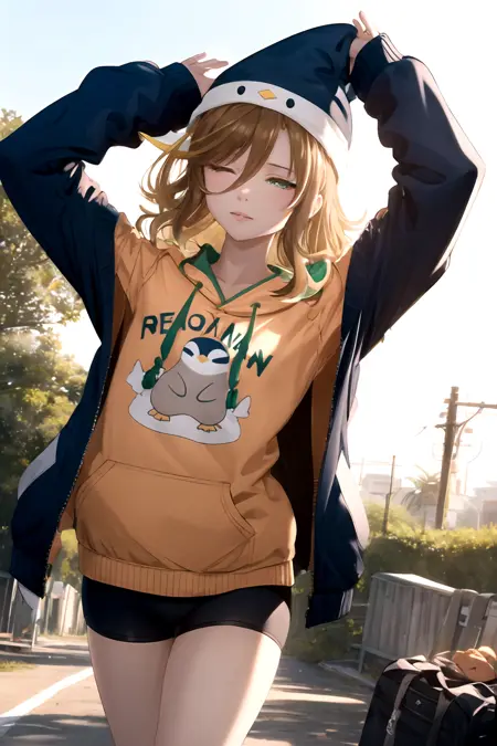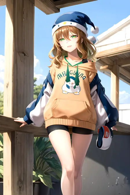 long hair, brown hair, long sleeves, hat, green eyes, jacket, shorts, hood, off shoulder, hoodie, black shorts, sandals, bike shorts, blue headwear, drawstring, orange hoodie,