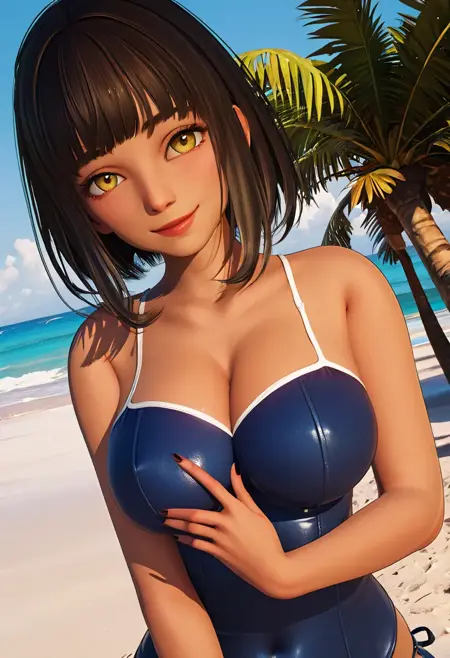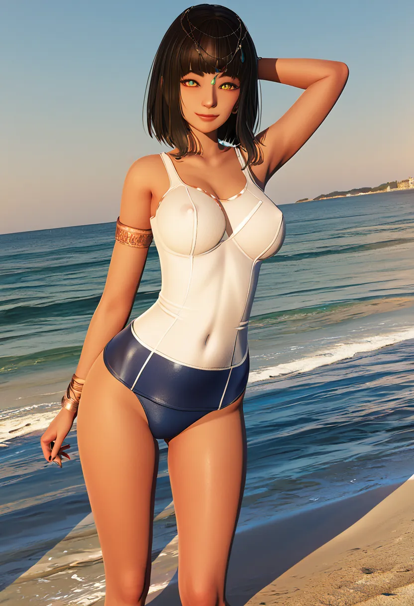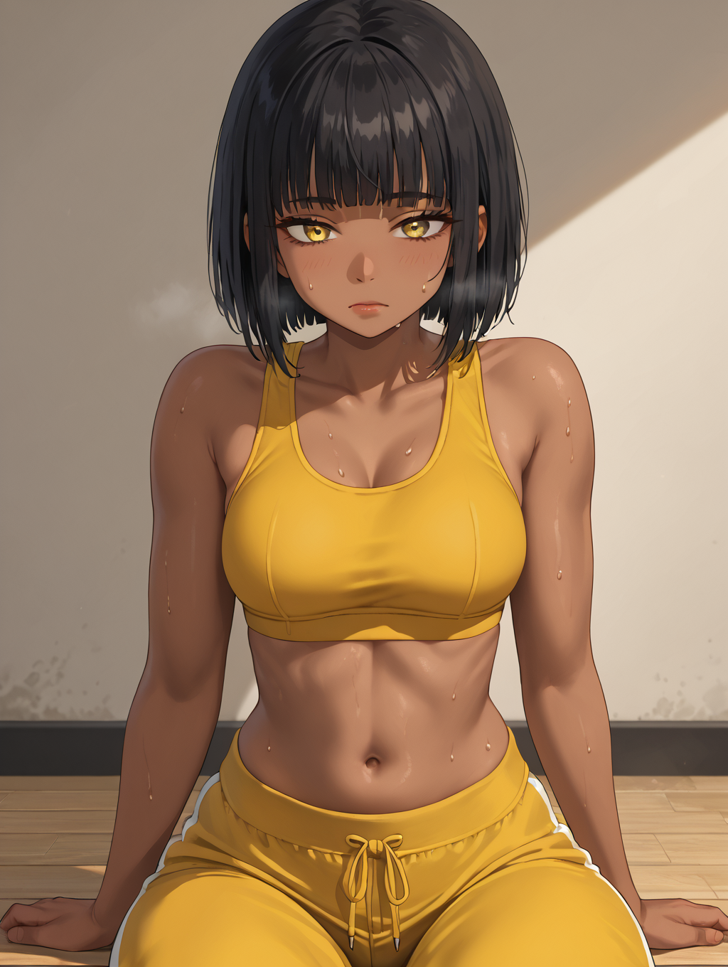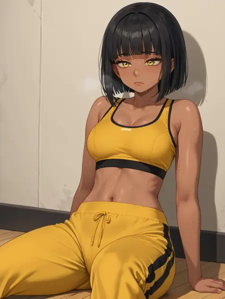 Maat, short hair, black hair, blunt bangs, yellow eyes, dark-skinned female, dark skin,