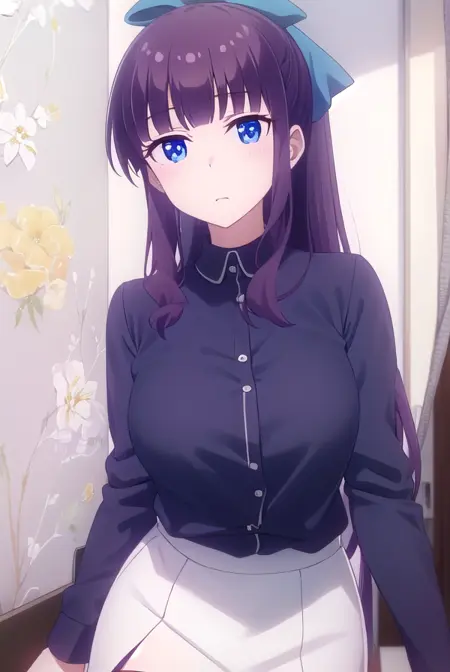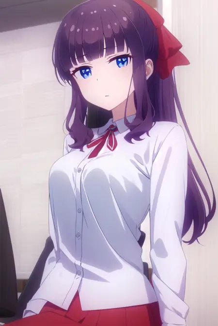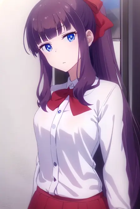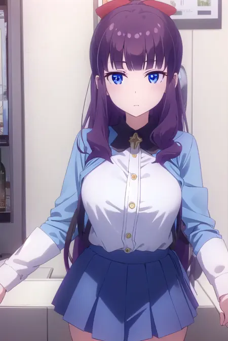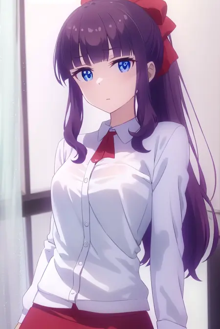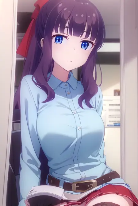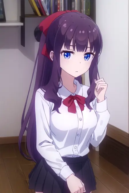 외모: takimoto hifumi, 긴 머리, 볼빨간색, 앞머리, 파란 눈, 포니테일, 보라색 머리, 머리리본, 리본,