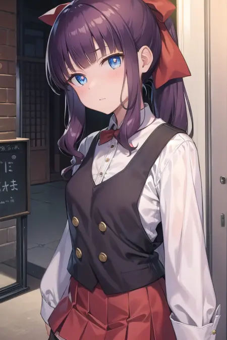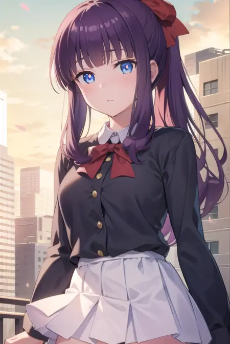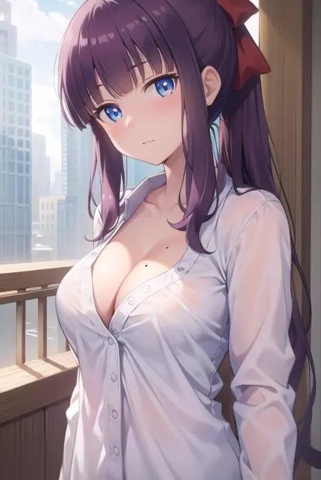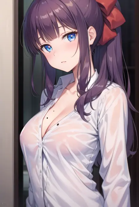 Appearance: takimoto hifumi, long hair, blush, bangs, blue eyes, ponytail, purple hair, hair bow, bow,