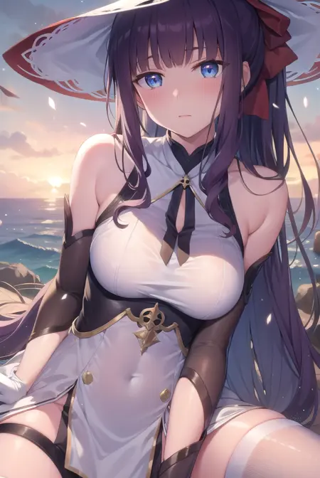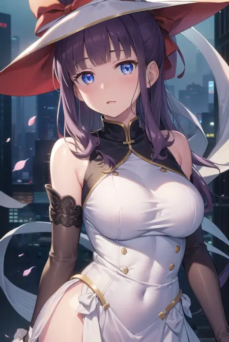 Witch Cosplay: gloves, hat, dress, bow, bare shoulders, sleeveless, elbow gloves, white gloves, white dress, witch hat, white headwear, pelvic curtain, side slit, low-tied long hair, large hat,