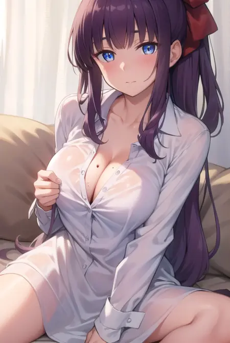 Sexy Attire: shirt, long sleeves, cleavage, collarbone, white shirt, collared shirt, mole, dress shirt, mole on breast, naked shirt,
