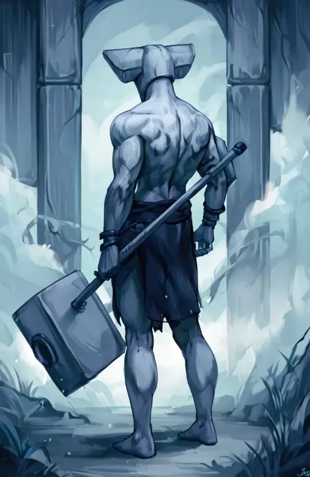 "mithrix_ror2, solo, 1boy, blue eye, colored sclera, helmet, muscular, abs, loincloth, pauldron, bracelet, jewelry"