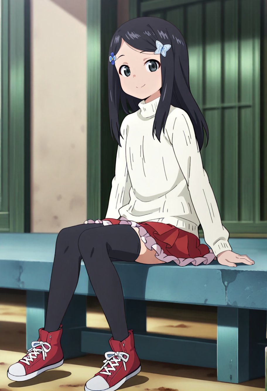 mitsuha-default,black eyes,black hair,long hair, hair ornament, white sweater, red skirt,pink skirt,frilled skirt, black thighhighs,red sneakers