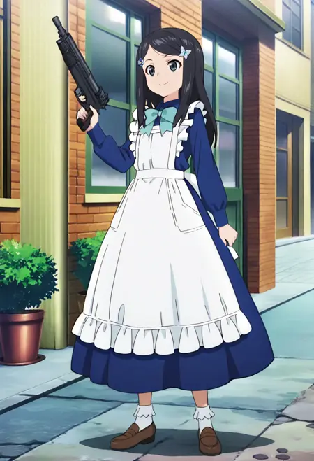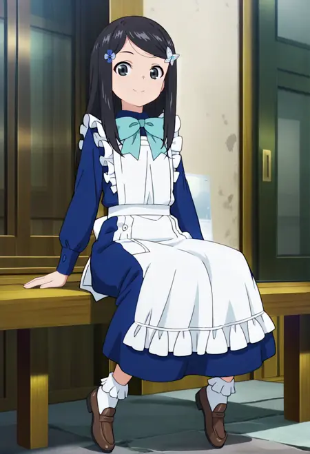 mitsuha-sales,black eyes,black hair,long hair, hair ornament,blue dress,long dress,maid apron,bobby socks,loafers