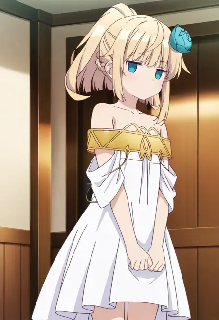 sora-default,blue eyes,blonde hair,ponytail, hair flower,strapless dress,white dress,off shoulder,white footwear,fairy wings