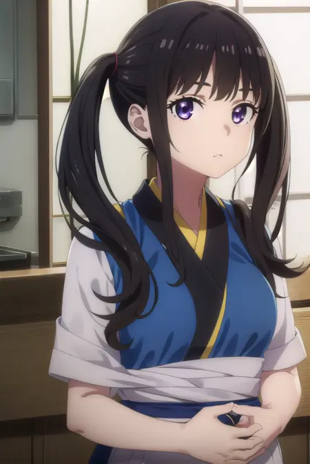 근무 중: 이노우에 타키나, 긴 머리, 앞머리, 더블티ails, 검은 머리, (보라색 눈:1.2),