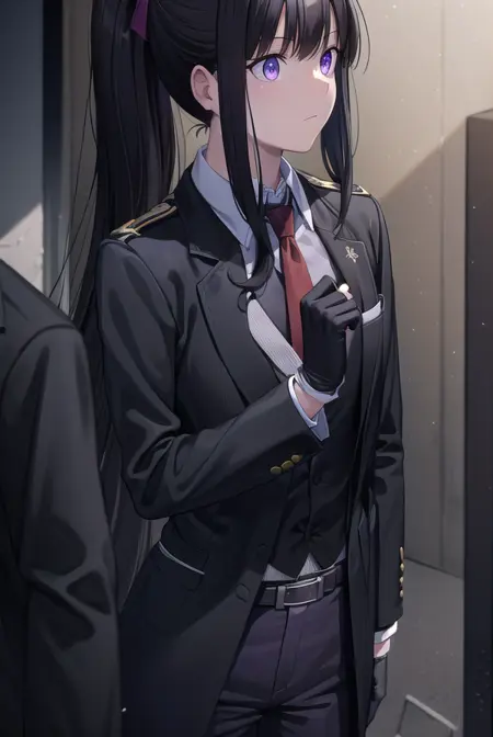 Undercover: 井上たきな、長い髪、前髪、ポニーテール、黒髪、(紫の目:1.2),
