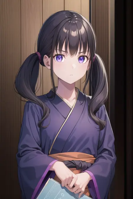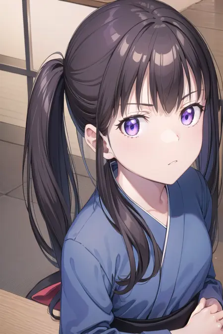 Working: 井上たきな、長い髪、前髪、ツインテール、黒髪、(紫の目:1.2),