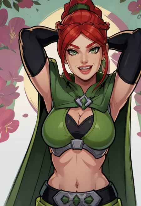 crop top, fingerless black elbow gloves, or detached sleeves, black thighhighs, green cape, black short shorts, or shorts,