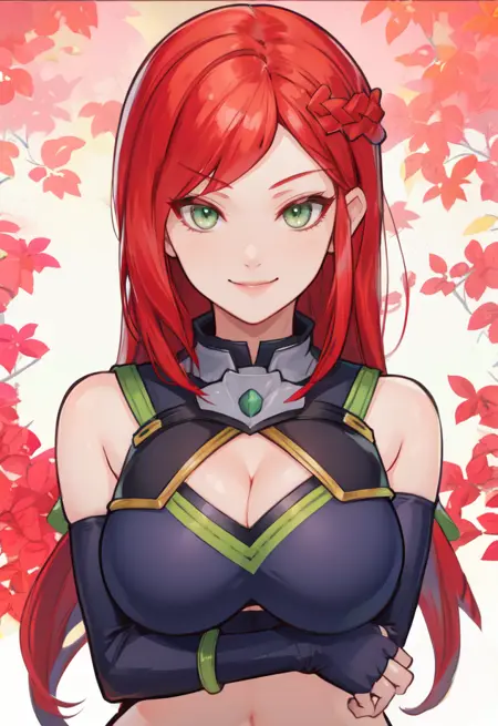 Cassie, red hair, green eyes, bangs, braided ponytail , or very long hair,