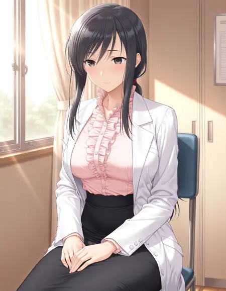 lab coat, light pink shirt, frilled shirt, black skirt, pencil skirt, medium skirt