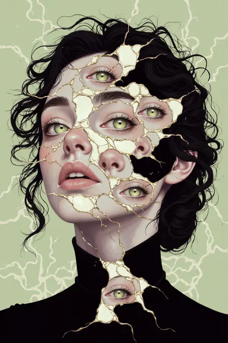 这种风格探索超现实且空灵的美学,将破碎或解构的人体形态与金属元素、流动的纹理和发光图案相融合。构图通常强调抽象的美感、扭曲的现实与超凡脱俗的氛围,将有机与机械元素结合成协调且视觉冲击力强的肖像。