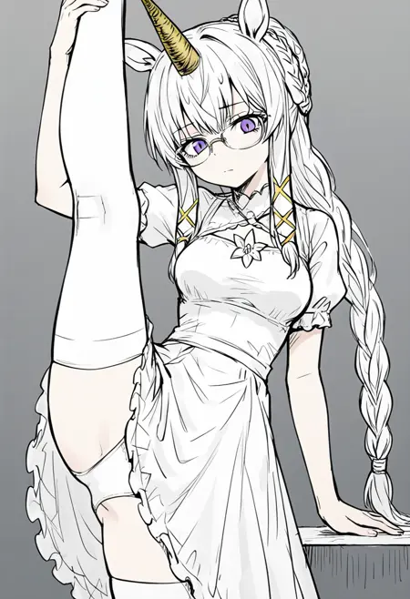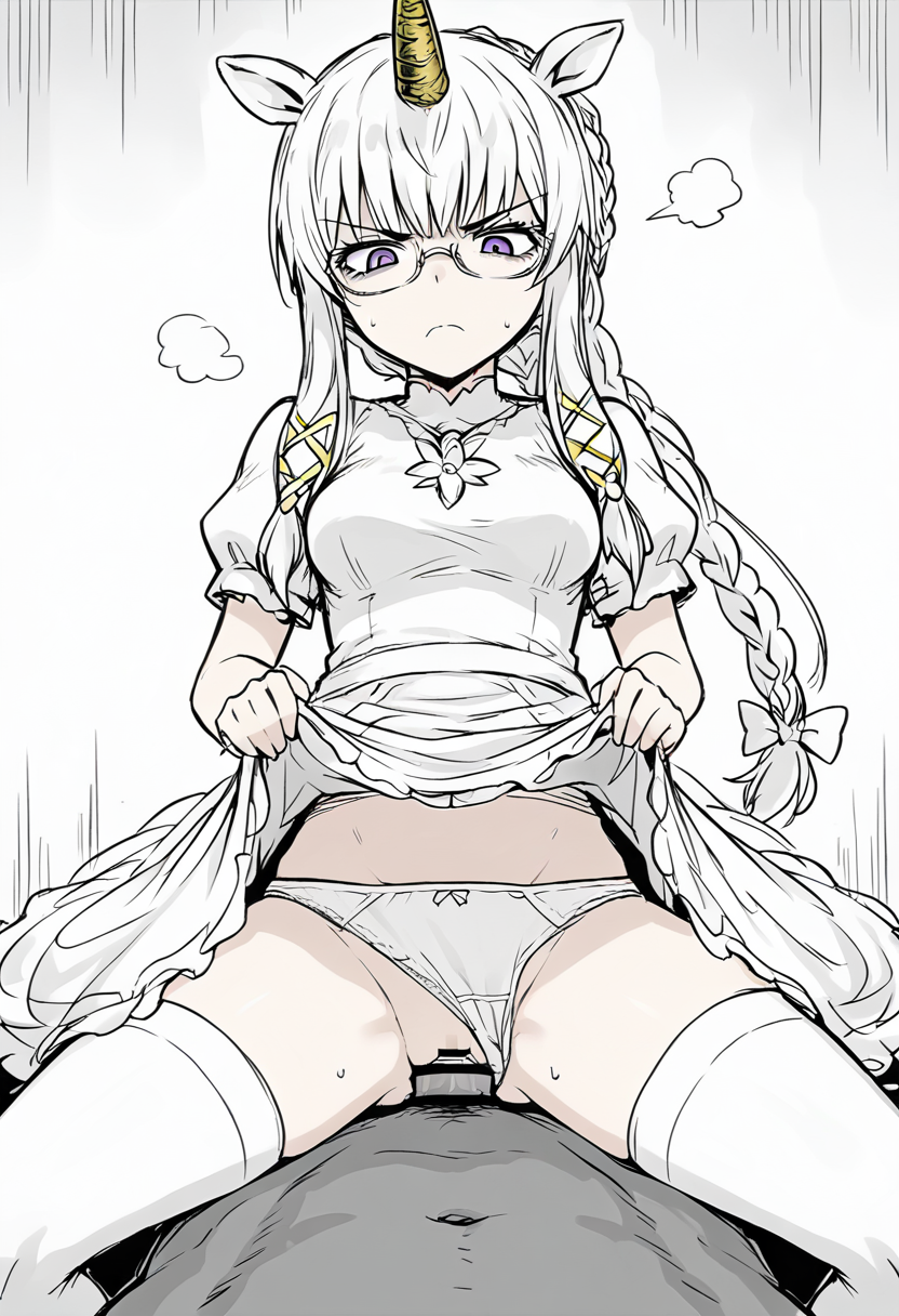 Unisbs2, 1girl, horns, single horn, purple eyes, white hair, sidelocks, braid, bangs, animal ears, horse ears, medium breasts, very long hair, long hair, dress, white dress, glasses, short sleeves, white stockings,