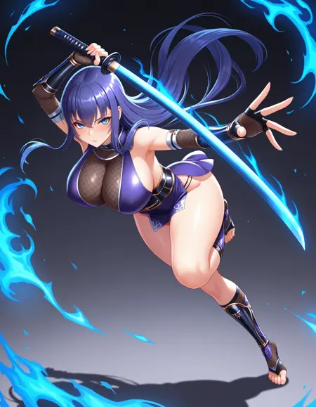 忍者, 短上衣, 紫色短上衣, 微裙, 紫色短裙, 黑色丝袜, 无指手套, 护臂, 黑色手套, 大腿靴,