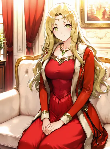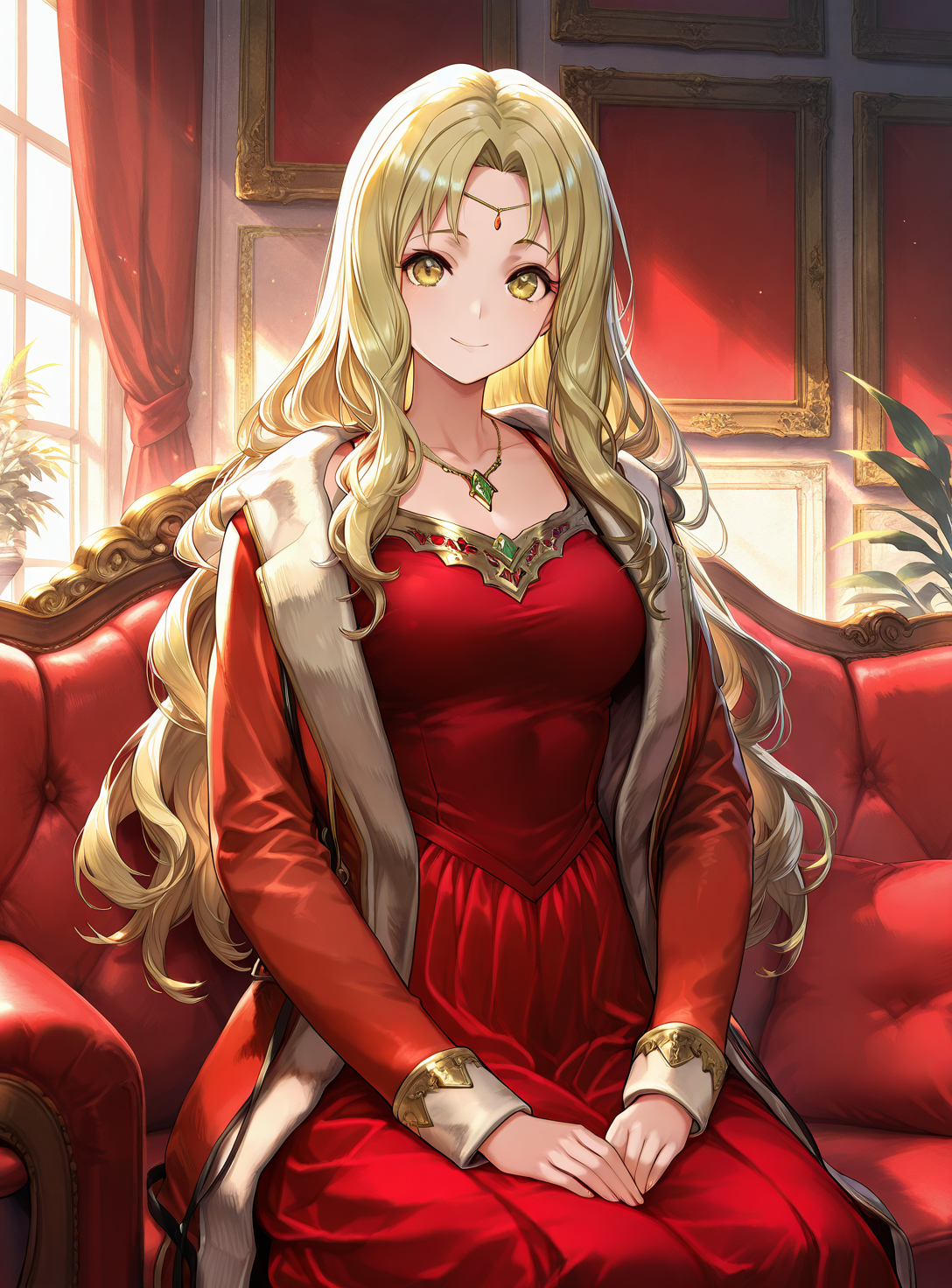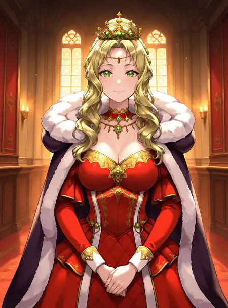 GuinevereQueen,red formal dress, fur-trimmed cape, long hair, single hair bun,crown,