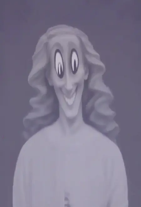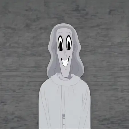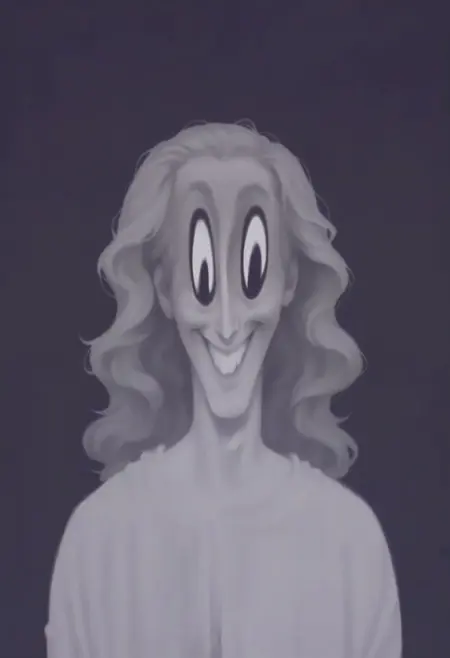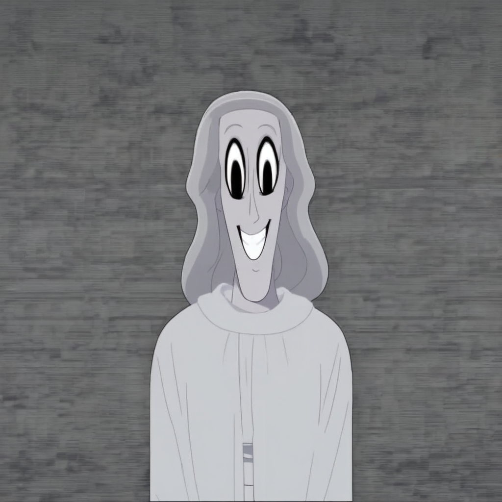 Archangel Gabriel, 1boy, solo, pale skin, grey hair, white robe, creepy smile, smile, stretched smile, big eyes, black eyes, monochrome, grayscale, horror \(theme\),