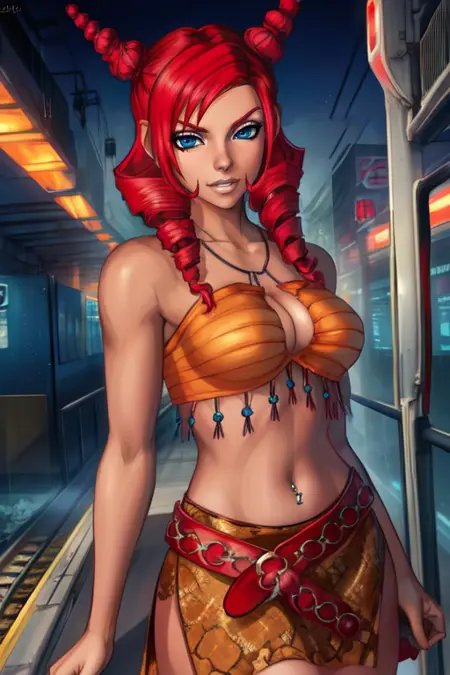 검은 팔꿈치 장갑, 부츠, 목걸이, 배꼽, 기모노, 띠, 빨간 팔 커버, 브라 없음