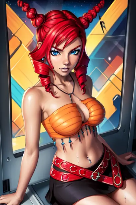 가슴 노출, 빨간 벨트, 스커트, 어깨 노출, 하이힐, 주황색 상의, 잠금뼈