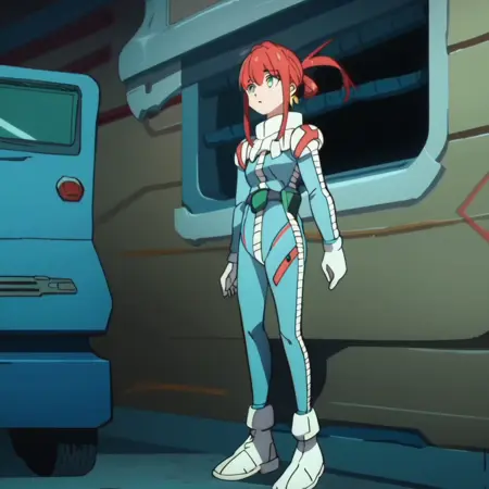 メイン: alma_CF、赤髪、長い前髪とサイドロックス、短い髪、片方の髪を結んだバング、髪飾り、浮遊する髪、ポニーテール、緑色の目、小胸(注:片方の髪を結んだバング、髪飾りは完全に正面から見たときには見えない)