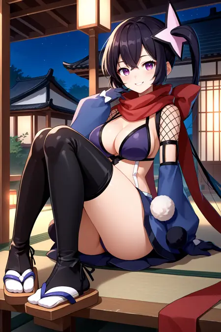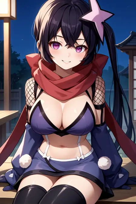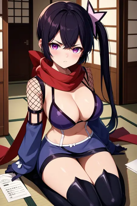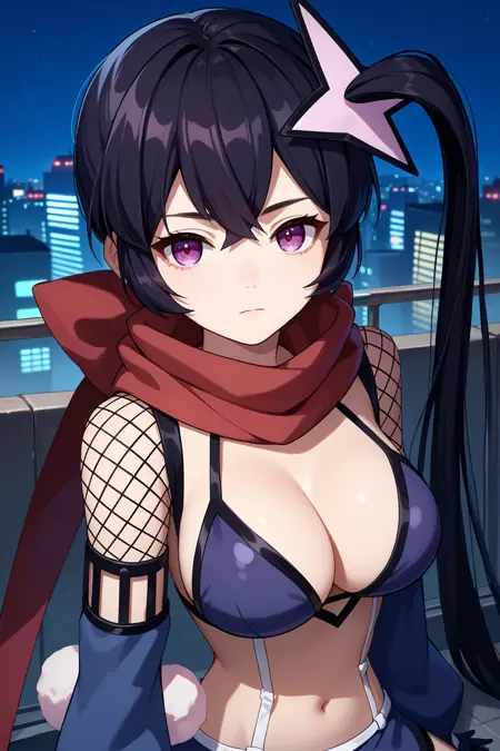 그녀의 전형적인 외모를 위해 "머리 장식, 빨간 스카프, 검은 비키니 상의, 패션 네트, 분리형 소매, 검은 장갑, 스트랩, 검은 치마, 검은 허벅지 스타킹"을 추가하세요.
