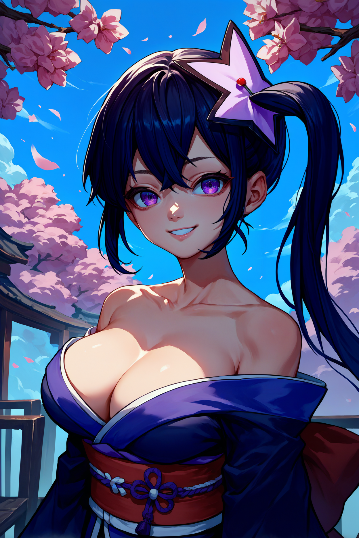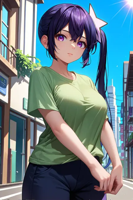 트리거 단어는 "mgrpRipple"이며, "검은 머리카락, 옆으로 묶은 파마, 보라색 눈"이 필수입니다.