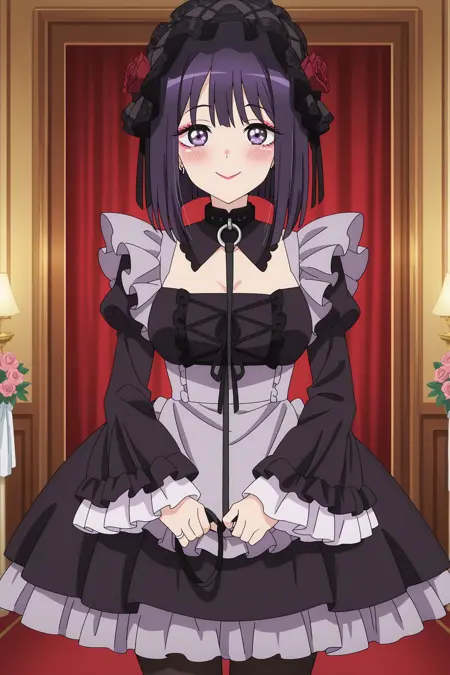 Shizuku Kuroe, cosplay, leash, wig, purple eyes, solo, purple hair, thighhighs, gothic lolita, lolita fashion, apron, frills, black thighhighs, dress, indoors, wide sleeves, chain leash, makeup, black dress, lipstick, nail polish, necktie, detached collar, hair ornament, breasts, flower, frilled dress