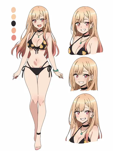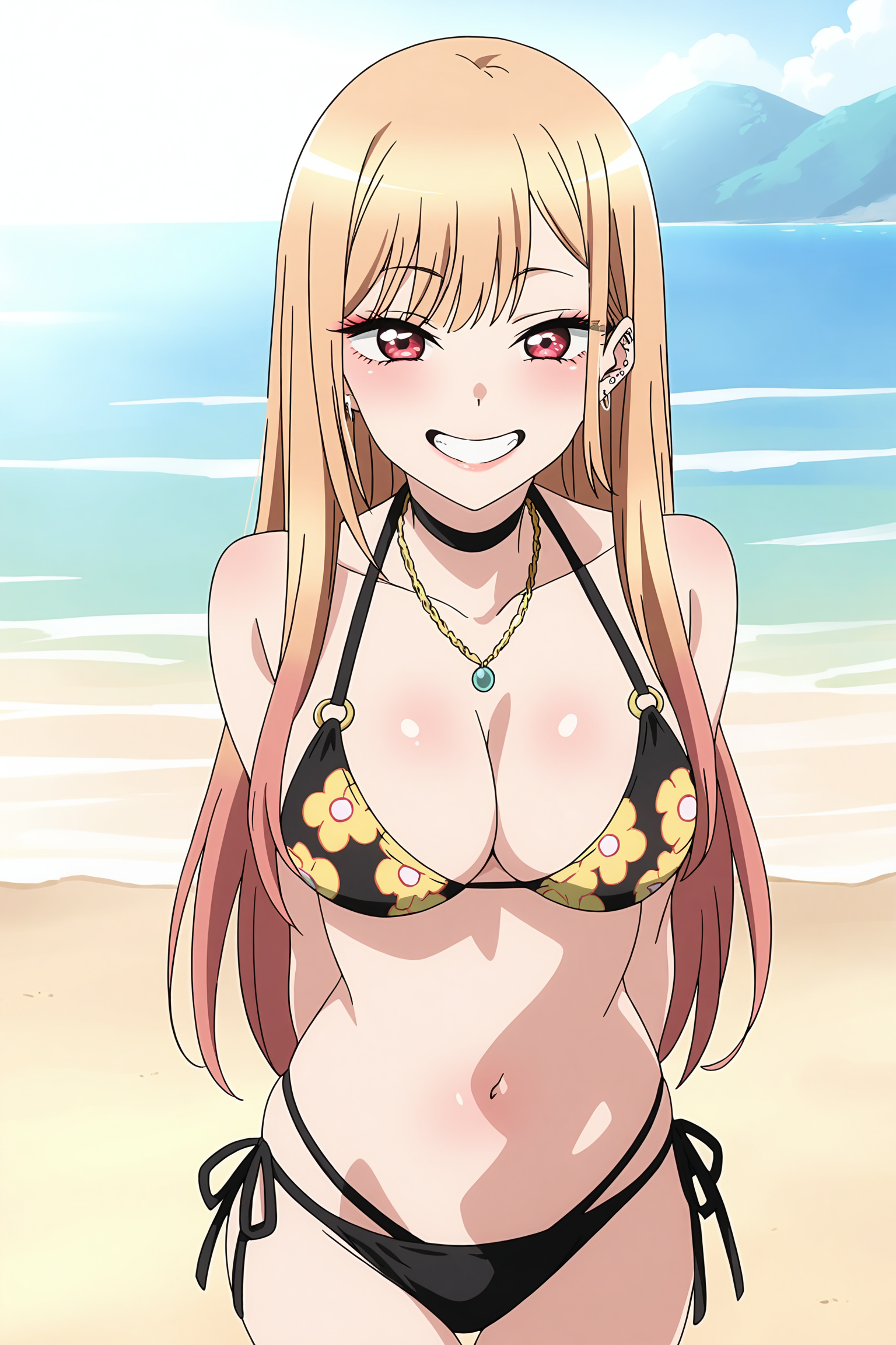 标准关键词:Marin Kitagawa, 1girl, 金发, 长发, 多色发, 红眼 | 粉色指甲, 指甲油, 指甲, 珠宝, 耳环, 耳洞, 项链, 项圈, 杆状耳钉, 手镯