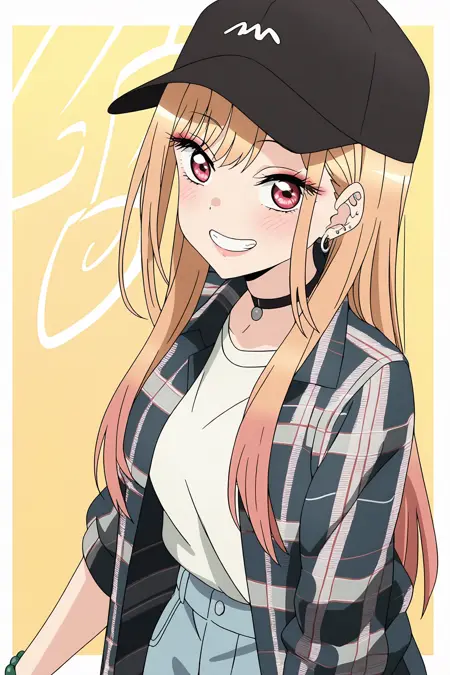 표준 키워드: Marin Kitagawa, 1girl, blonde hair, long hair, multicolored hair, red eyes | pink nails, nail polish, fingernails, jewelry, earrings, ear piercing, necklace, choker, barbell piercing, bracelet